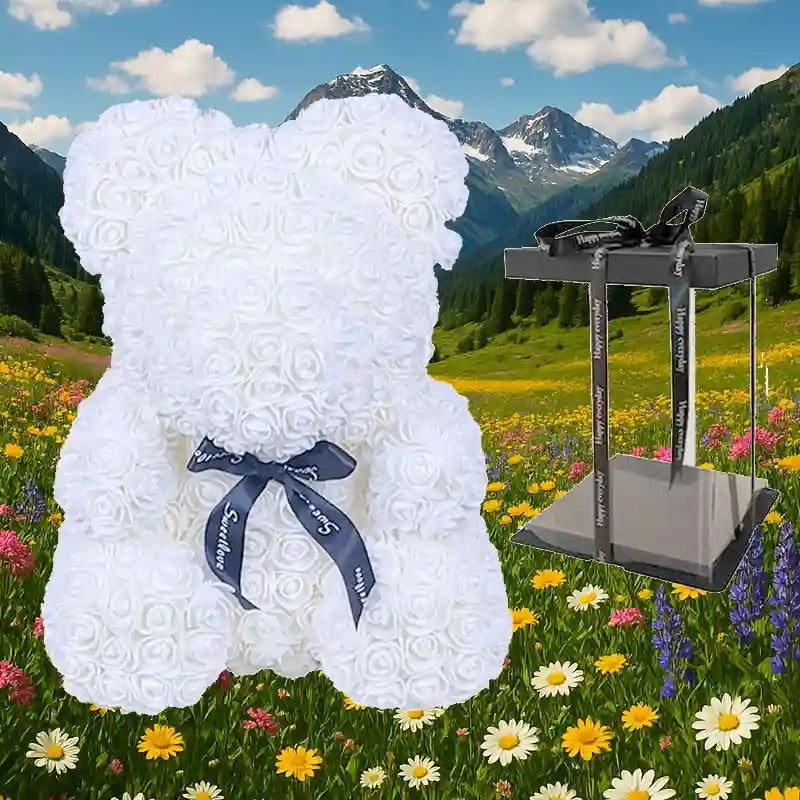 Si vous hésitez entre un ours en peluche et une fleur pour votre bien aimé(e), cet Ourson en rose blanche est la combinaison parfaite !
